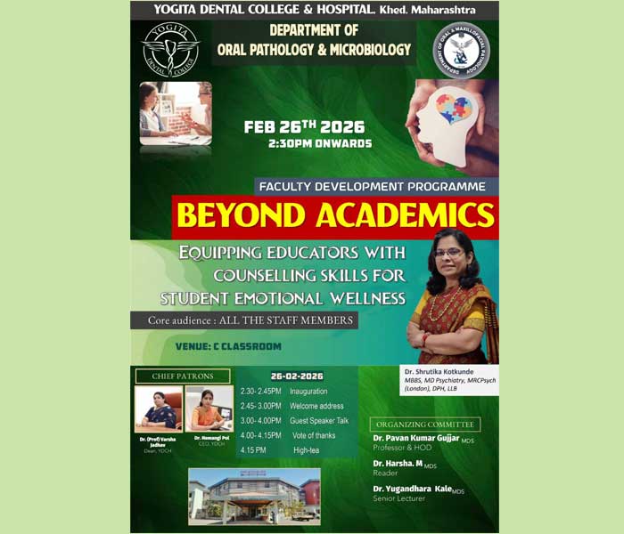 Faculty Development Program beyond academics by Oral path Posted by admin Categories Ongoing Events Date February 26, 2026 Share: admin Previous post Oral Pathaologist Day Celebration February 26, 2026 Next post CDE PROGRAM - Basic surgical skills and basics of implantology February 28, 2026 You may also like CDE PROGRAM – Basic surgical skills and basics of implantology 28 February, 2026 Oral Pathaologist Day Celebration 25 February, 2026 Periodontics Day 23 February, 2026